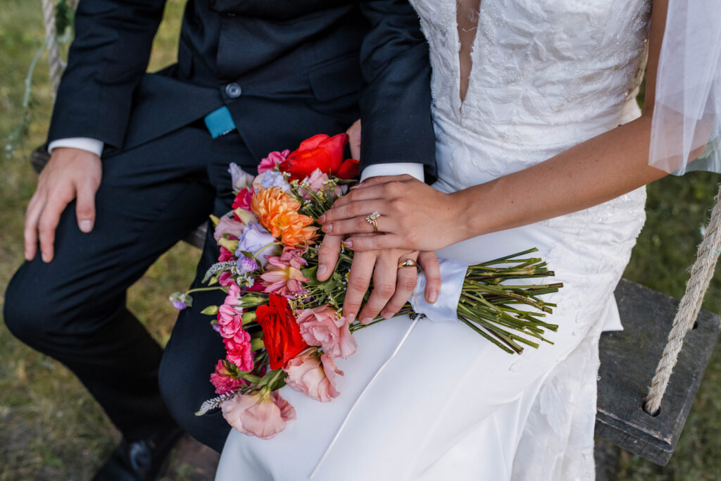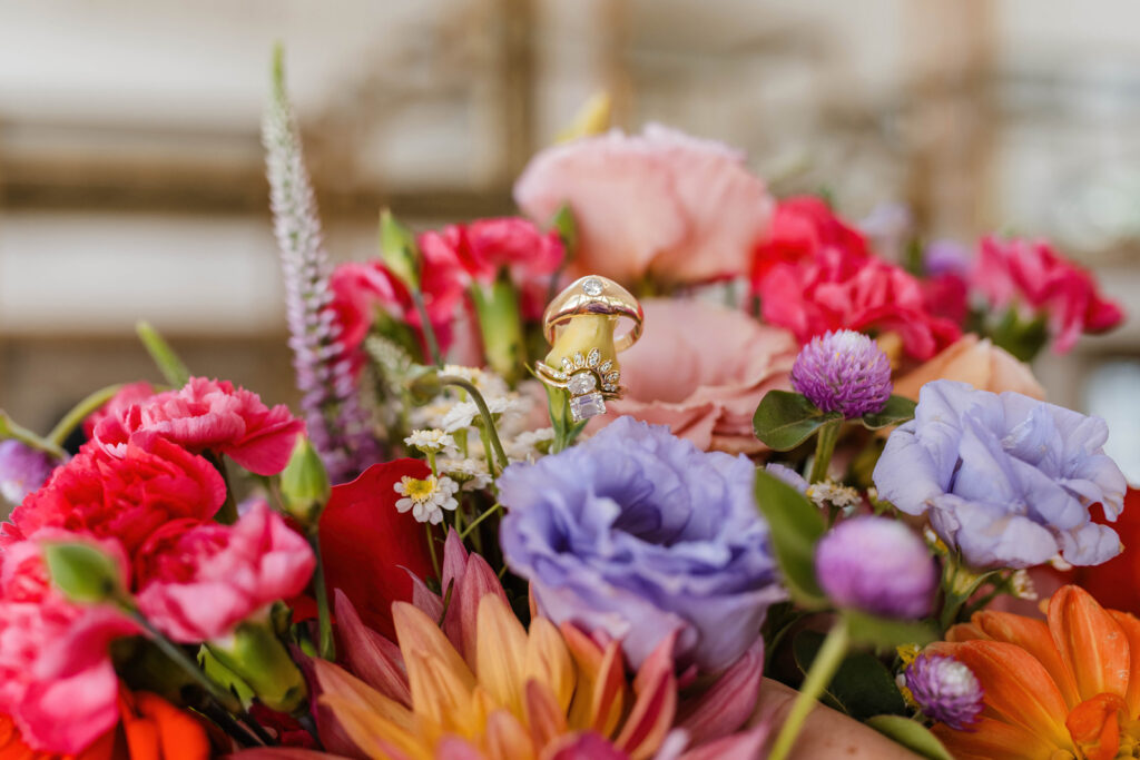 Double exposure of couple almost kissing and bride's colorful wedding bouquet.