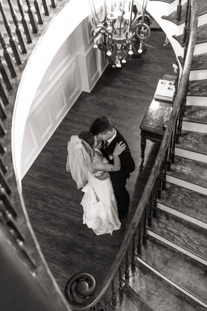 • The staircase in the mansion was so elegant and perfect for bridal portraits or couple portraits—we loved to play with the reflections in the mirrors that lined the wall next to the spiral staircase.