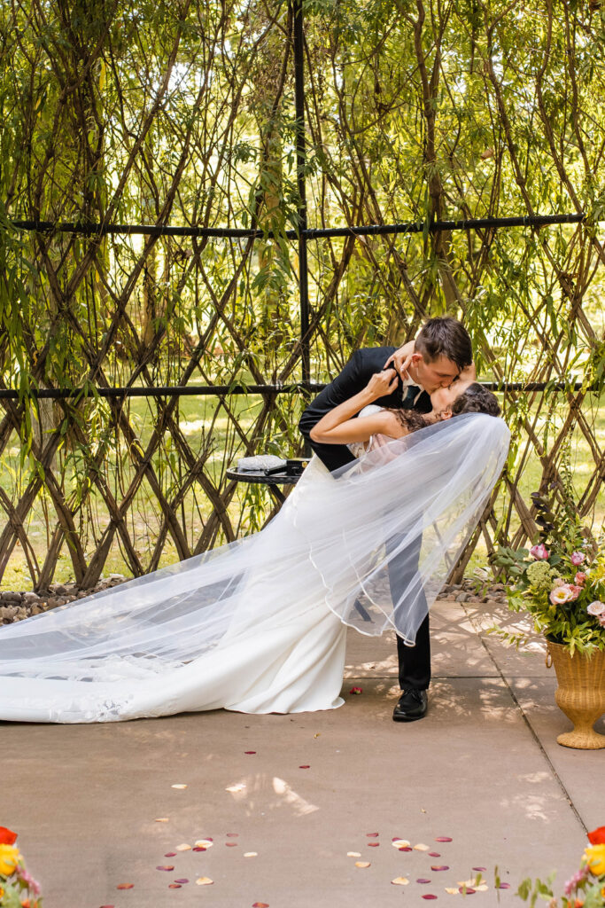 Groom kisses bride in front of Willow Chapel at Black Iris Estate.
